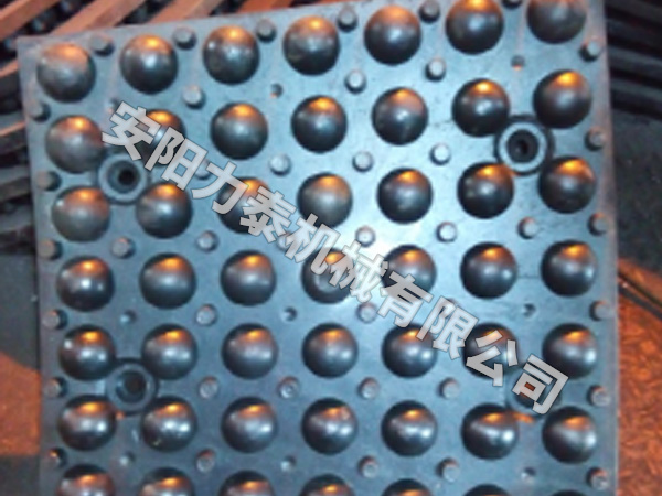 造球盤底襯安裝鑄石材料后,短期內(nèi)會在球盤底面形成一層底料,可以加速成球過程,但是在使用一段時(shí)間后,由于底料在生球不斷滾動(dòng)的作用下將變得越來越緊密,底料的溫度不斷升高,疏松的物料很容易粘附在其表面,使底料加厚,隨著底料的逐漸加厚,造球盤的負(fù)荷增加,同時(shí)由于鑄石板的自身比重較大,兩種負(fù)荷加在一起給球盤的傳動(dòng)部位造成很大阻力,致使傳動(dòng)部位的軸承、齒輪極易損環(huán),電耗增加,給生產(chǎn)和維修帶來很大麻煩,加大了維修工人的勞動(dòng)強(qiáng)度,提高了維修費(fèi)用,降低了生產(chǎn)效率。 根據(jù)我公司與燒結(jié)球團(tuán)行業(yè)的一些相關(guān)技術(shù)人員和專家的多方面交流以及我們多年來在制作球盤內(nèi)襯方面的一些經(jīng)驗(yàn)總結(jié),在球盤底部采用表面帶有圓柱體的高耐磨造球